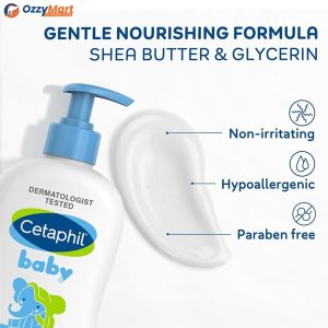 Cetaphil Baby Daily Lotion with Shea Butter gently hydrates, softens and nourishes your little one’s delicate skin while preserving its protective moisture barrier. This formula is gentle for use on the face and body, hypoallergenic, and tear-free.