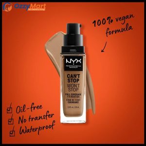Introducing the NYX 30ml Foundation Cant Stop Wont Stop Full Coverage in Caramel. This foundation is designed for those who seek a flawless finish that lasts all day. With its full coverage formula, it effectively conceals imperfections while providing a natural matte look.